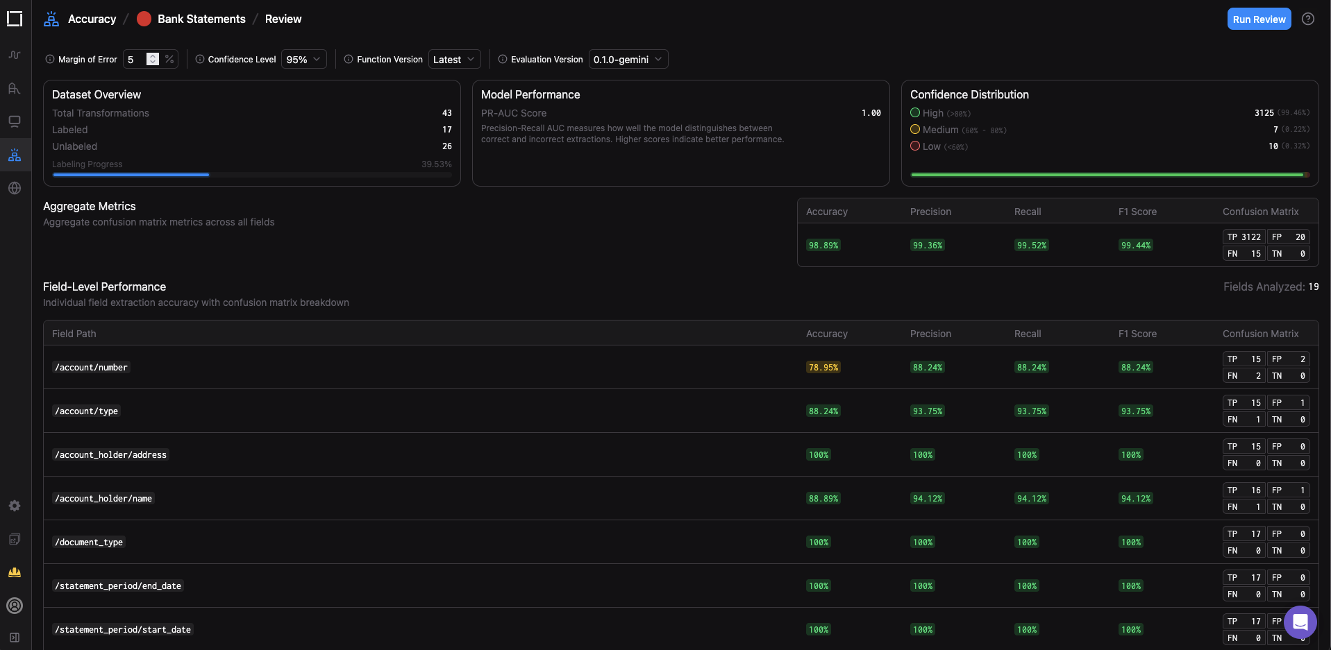 Function Review immediately shows your model’s statistical performance — precision, recall, accuracy, and more — all derived from your real-world data.