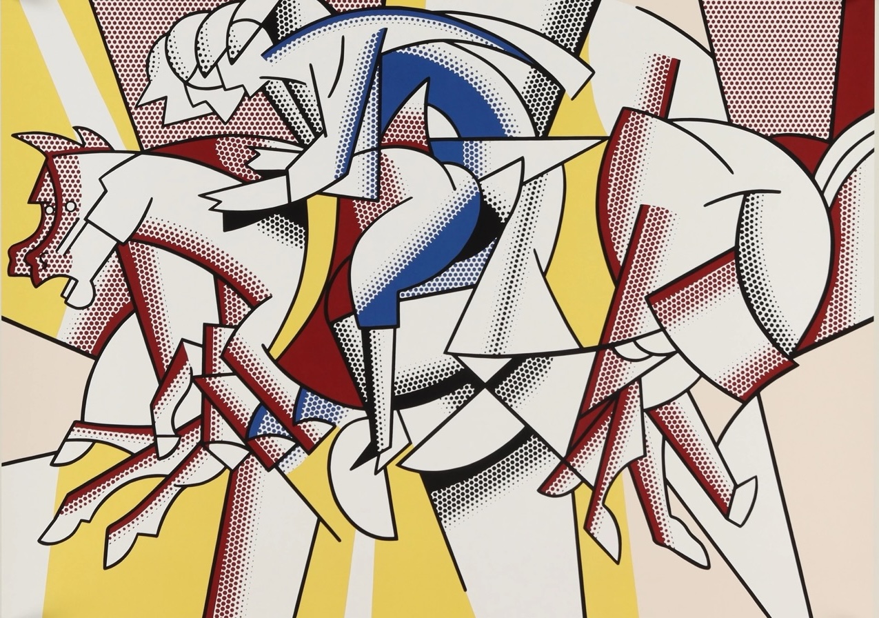 The painting above is The Red Horseman, by Roy Lichtenstein. The original lives at the MUMOK in Vienna. Lichtenstein explored futurism in the 1970s (what today we call "pop-futurism"), and he based this painting on the original by Carlo Carrà, a 1910s Italian futurist. With this rendition, he was a bit cheeky; while it looks like a homage, he detaches himself from the politics of futurism by "freezing" the horse instead of giving it movement.